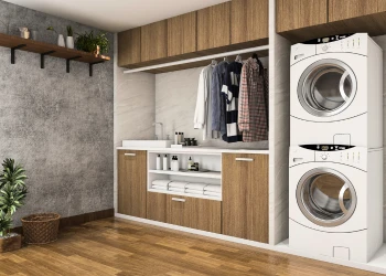 5) If your laundry room is more of a laundry closet, stack your washer and dryer on top of each other, European style, and use the adjacent space to install some shelving or a wall unit to organize your laundry needs.